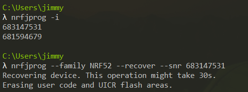 - Use nrfjprog.exe -f NRF52 –recover