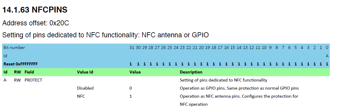 | 0x20C | NFCPINS | Setting of pins dedicated to NFC functionality: NFC antenna or GPIO |