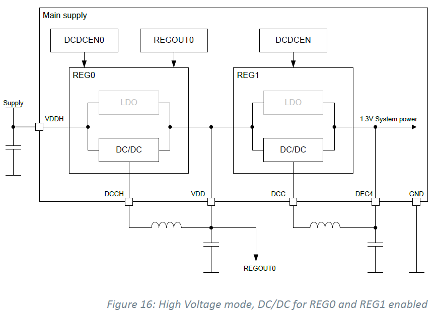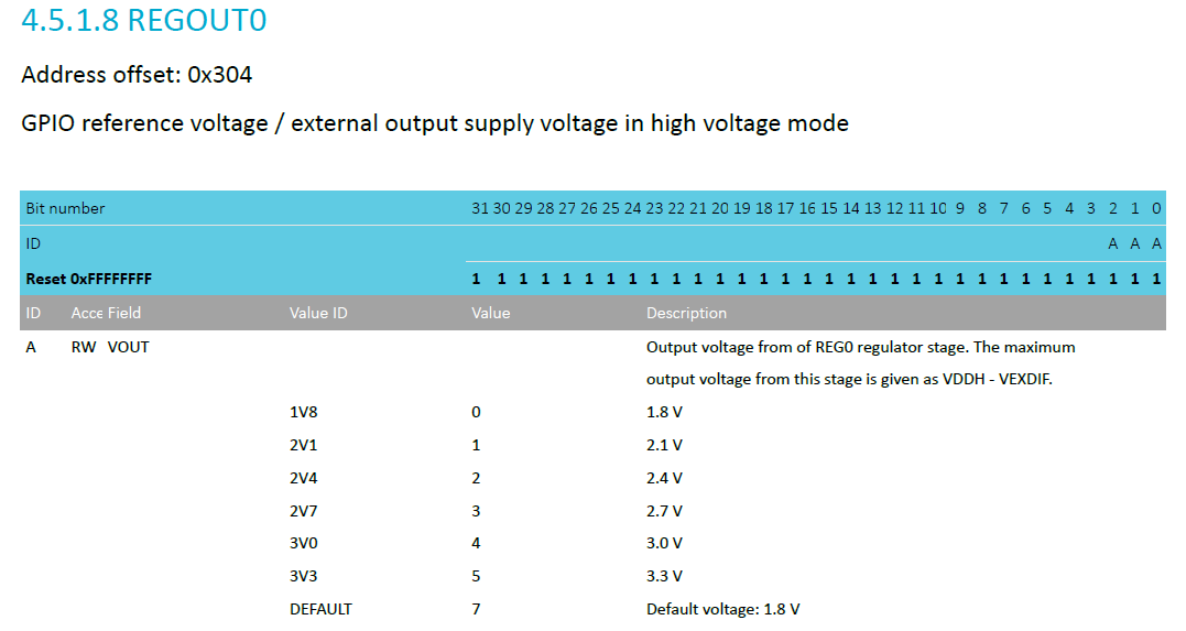 | 0x304 | REGOUT0 (nRF52840 only) | GPIO reference voltage / external output supply voltage in high voltage mode |