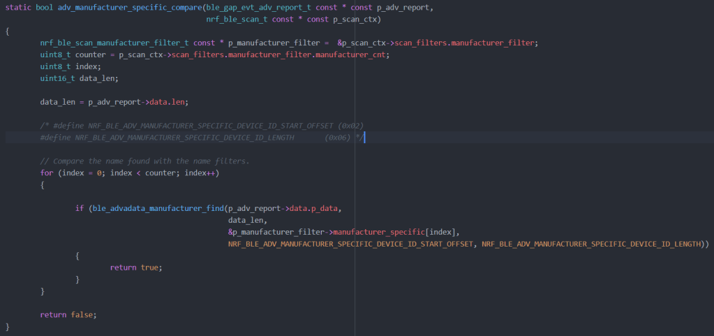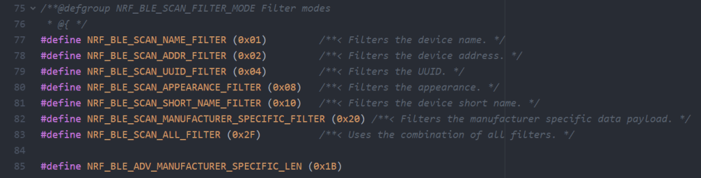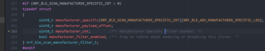 | 6) Manufacturer Specific Data | Filter set to the target manufacturer specific data payload The maximum number of filters of this type corresponds to NRF_BLE_SCAN_MANUFACTURER_CNT. |