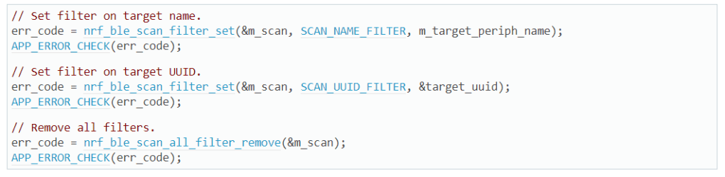 | 5) Appearance | Filter set to the target appearance. The maximum number of filters of this type corresponds to NRF_BLE_SCAN_APPEARANCE_CNT. |