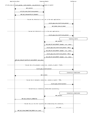 | Resuming scanning | The Scanning Module resumes scanning after receiving advertising reports. Scanning stops if the module established the connection automatically, or if the application calls nrf_ble_scan_stop or sd_ble_gap_connect. |