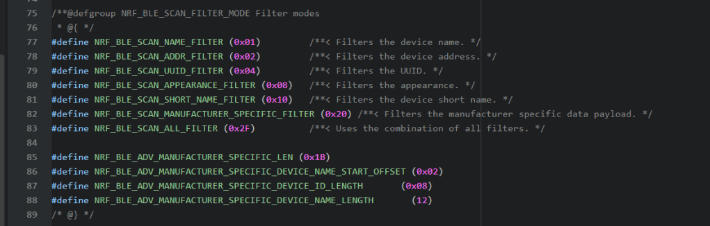 | Short name | Filter set to the short target name. The maximum length of the name corresponds to NRF_BLE_SCAN_SHORT_NAME_MAX_LEN. The maximum number of filters of this type corresponds to NRF_BLE_SCAN_SHORT_NAME_CNT. |