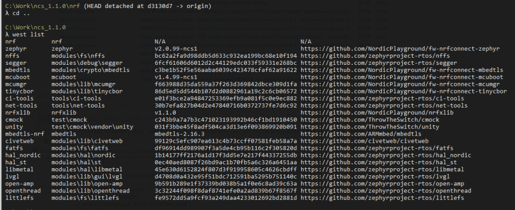 To manage the nrf repository (the manifest repository), use Git. To make sure that you have the latest changes, run git fetch origin to fetch the latest code from the fw-nrfconnect-nrf repository. Checking out a branch or tag in the nrf repository gives you a different version of the manifest file. Running west update will then update the project repositories to the state specified in this manifest file. For example, to switch to release v1.1.0 of the nRF Connect SDK, enter the following commands in the ncs/nrf directory: