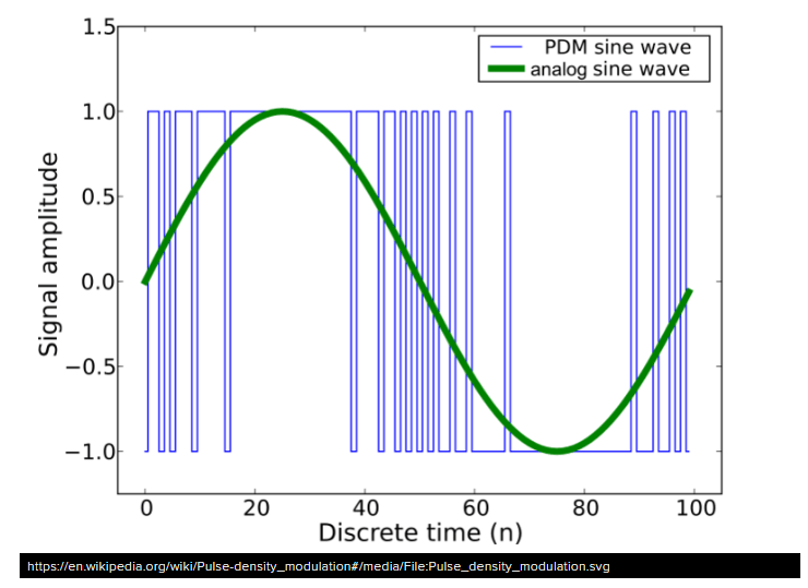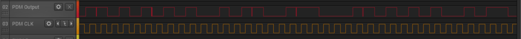 PDM is a little like 1-bit PWM. You clock the mic with a 1 MHz – 3 MHz clock rate, and on the data line you’ll get a square wave out that syncs with the clock. The data line with be 0 or 1 logic output, with the square wave creating a density that when averaged will result in the analog value out.
