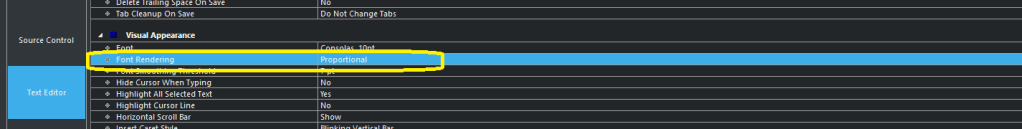 For the display of the font, it needs to configure (Text Editor -> Visual Appearance –> Font Rendering –> Proportional