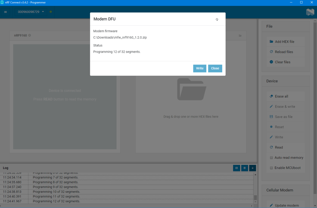 For example, it uses the programmer to download the latest LTE modem firmware (mfw_nrf9160_1.2.0.zip).
