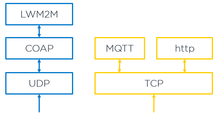 Basically, LwM2M and COAP are at the top of UDP. MQTT and HTTP are on the top of TCP. According to the paper “UDP and TCP performance investigation in energy efficient“, UDP is much fit on the low power connectivity solution.