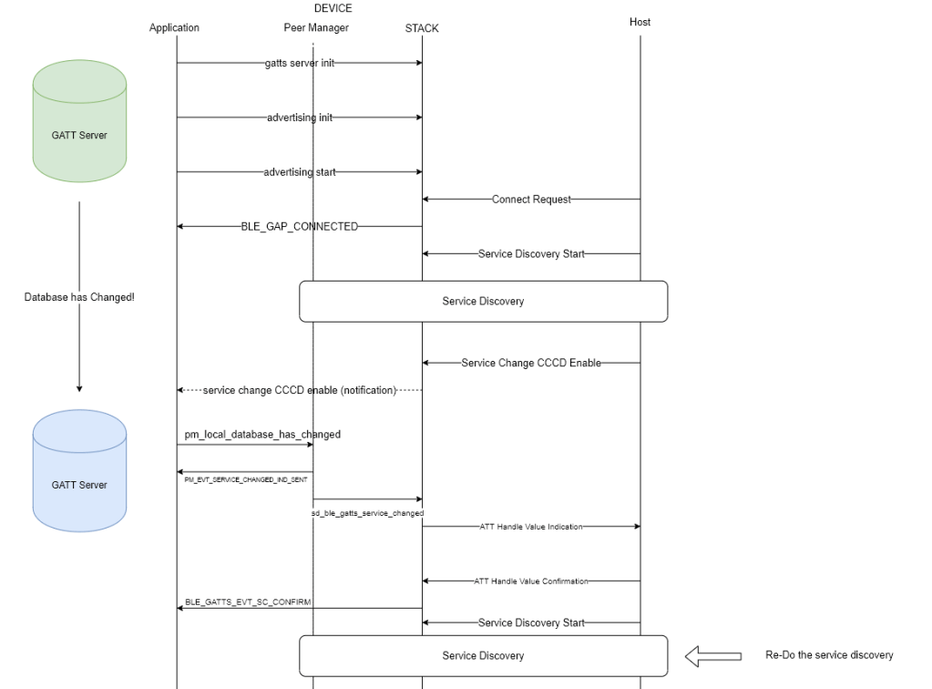 This blog is to describe about the Service Change handling on the BLE GATT. For example, there is a GATT Server at the BLE Peripheral Side. By using the service change indicator approach, it can force the host side to re-do the service discovery.
