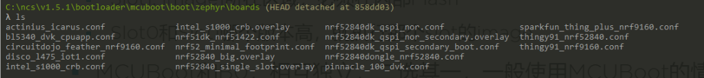 Inside the boot\zephyr\boards folder, you can find that there are multiple difference configurations such as nrf52_minimal_footprint.conf, nrf52840dk_qspi_nor.conf, nrf52840dk_qspi_secondary_boot.conf.