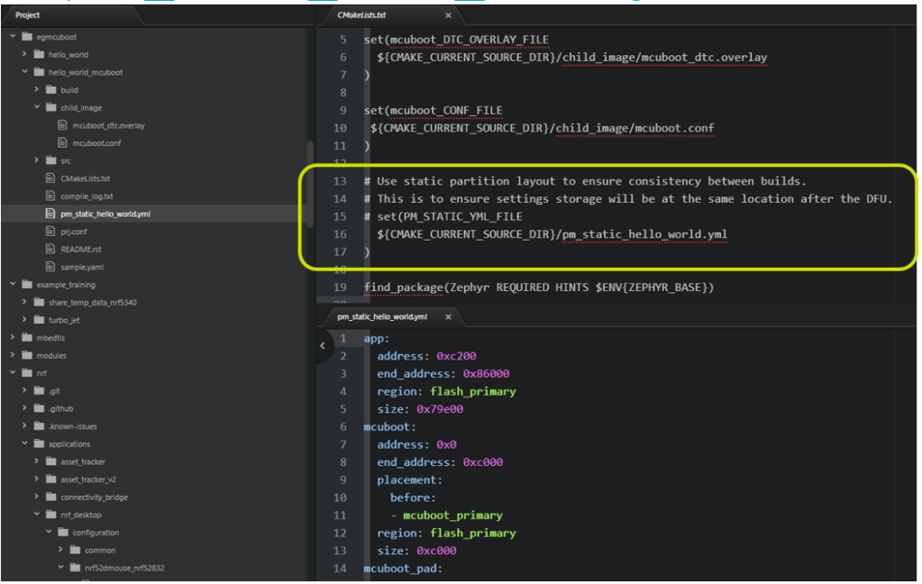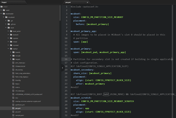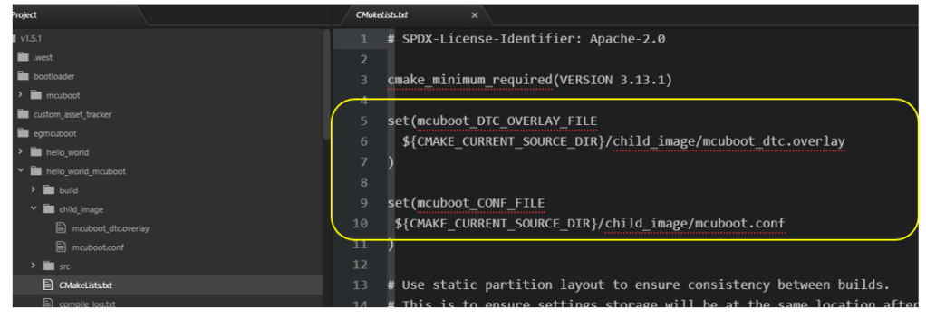 - Add the switch “CONFIG_BOOTLOADER_MCUBOOT=y” inside the prj.conf