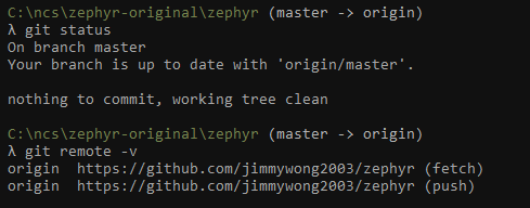 origin https://github.com/<your github id>/zephyr (fetch) origin https://github.com/<your github id>/zephyr (push) upstream https://github.com/zephyrproject-rtos/zephyr (fetch) upstream https://github.com/zephyrproject-rtos/zephyr (push)