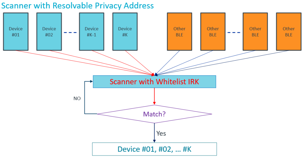 This blog is to introduce how to scan the number of target devices what are more than the maximum whitelist entry (8). The method is to use the resolvable random private address and put the whitelist with IRK.
