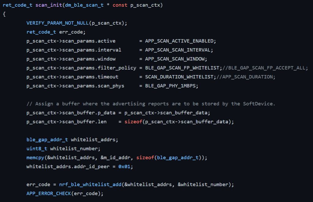 Nowadays, if your mobile tries to scan on the target device, it would get a hundred of BLE devices nearby. In order to filter out the devices, the most straightforward is to use the whitelist approach. It means to put all the target device address inside the BLE scanner whitelist. However, the number of target devices is limited by the size of the whitelist. In Nordic BLE softdevice stack, the maximum size of the whitelist is 8. The method how to use a whitelist for BLE scanner is described in my previous blog (URL).