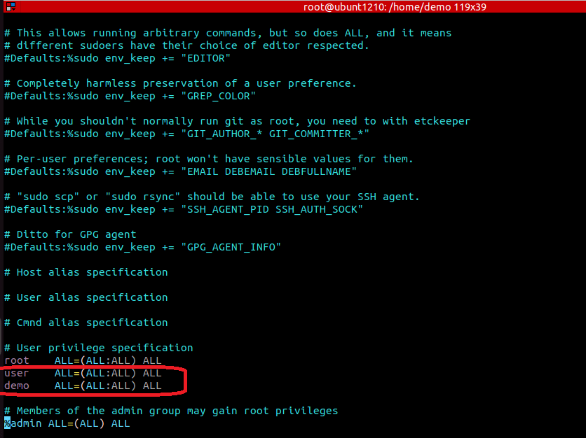 Here, the usermod command allows us to modify our user’s attributes. In particular, we use the -G option to declare that we’d like to update the group information for our user demo. Also, the -a option makes certain that other groups associated with this user aren’t deleted in the process. As a result, demo can now perform administrative tasks with sudo