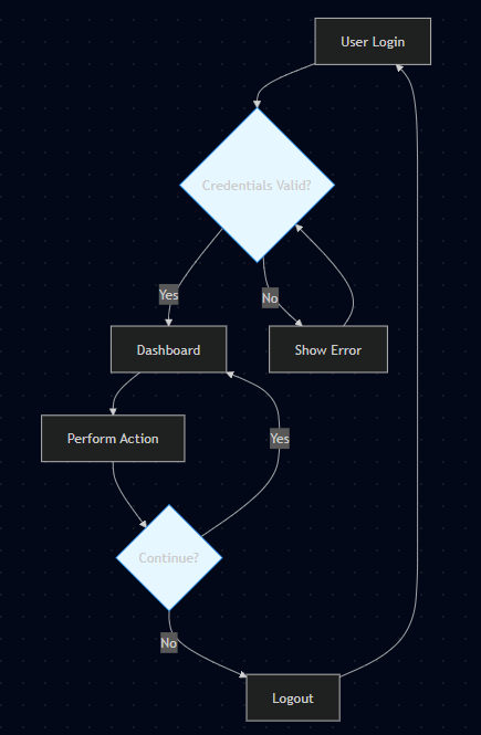 This example shows a simple user authentication flow with decision points highlighted in blue.